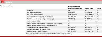In the study period, 80 patients fulfilled the inclusion criteria; due to protocol violations, 21 patients were never asked to participate and 11 patients refused inclusion. Therefore, a total of 48 patients were randomized. Afterwards, there were six dropouts as four patients were re-operated because paraffin sections showed micrometastasis in their sentinel node, one patient randomized to the Control Group was re-operated on day three because of infection and suspicion of necrotizing faciitis, which was not confirmed. Finally, one patient randomized to the methylprednisolone sodium succinate group was treated with glucocorticoid day one after surgery due to an allergic reaction. The final study group thus consisted of 42 patients: 20 patients randomized to the methylprednisolone sodium succinate group and 22 patients to the control group. The two groups were identical in terms of patient characteristics such as age, body mass index (BMI) and blood pressure. Surgery characteristics like type of operation, operation time and peroperative bleeding were also similar in the two groups (Table 2).