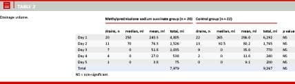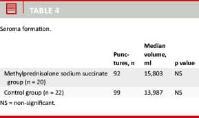 In order to evaluate the possible effect of the steroid injection on fluid production, the postoperative course was divided into two periods: the fluid production in the period with drains (postoperative days 1-5) and the fluid production in the post-drain period, known as seroma. There was no difference between the groups in terms of the number of patients having drains from day to day (Table 3). The drainage volume was lower in the methylprednisolone sodium succinate group than in the control group; however, the difference was not significant (7,979 ml versus 9,267 ml) (Table 3).