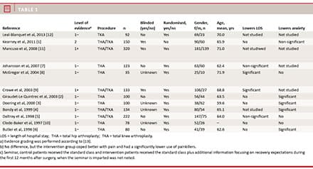 5. Daltroy LH, Morlino CI, Eaton HM et al. Preoperative education for total hip and knee replacement patients. Arthritis Care Res 1998;11:469-78.