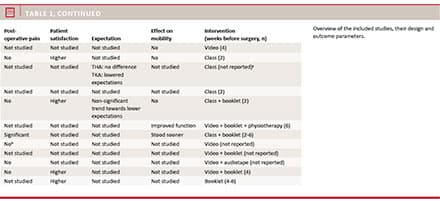 undergoing THA, one study involved TKA cases, whereas five studies comprised both THA and TKA. The outcomes of the studies were assessed preoperatively and/or until discharge. Preoperative education was given within six weeks (range: 1 day-6 weeks) of arthroplasty surgery. The methods used to provide the preoperative education varied: booklets, seminars, videotapes.
