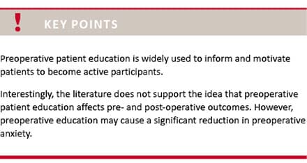 There is limited – if any – pooled evidence supporting preoperative education, but this conclusion may be flawed by the general heterogeneity of the pooled