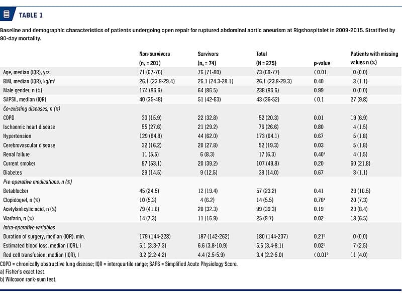 Ruptured abdominal aortic aneurism (rAAA) is a severe condition with all-cause mortality rates reaching 80% [1]. Roughly two thirds of patients with rAAA reach the hospital and 40% of these die before surgery [1]. The incidence of rAAA in Denmark is 83/1,000,000, corresponding to 400 to 520 new annual cases [2]. The 30-day mortality rate in Denmark has remained stable around 30-40% in the past two decades [2].