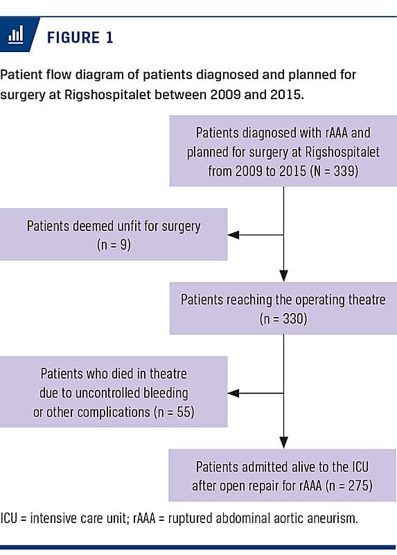 We included all consecutive patients with the International Classification of Diseases-10 code DI71.3 (ruptured abdominal aortic aneurism), surgically treated for rAAA at Rigshospitalet. Patients who died before surgery or before reaching the ICU were excluded. Also, patients with non-ruptured AAA, ruptured thoracoabdominal aortic aneurisms or iliacal aneurisms were not included. No other exclusion criteria were applied.