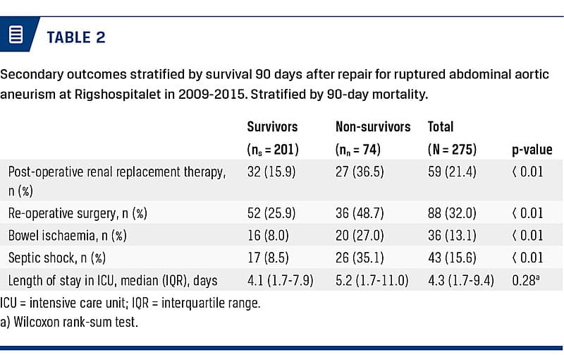 This was a population-based retrospective cohort study of patients post-operatively admitted to the intensive care unit (ICU) following surgery for rAAA at Rigshospitalet between 1 January 2009 and 31 December 2015. We have prepared this manuscript according to the Strengthening the Reporting of Observational Studies in Epidemiology statement [6]. The study was approved by the Danish Data Protection Agency (RH-2016-391) and The Danish Health Authority (3-3013-932/I). As the design of the study was observational, ethical approval was waived by the regional research ethics committee.