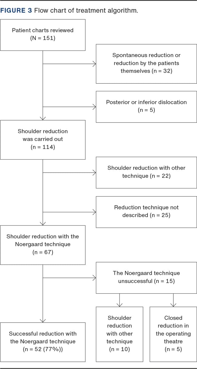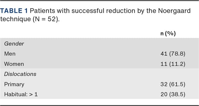 One limitation of this study is its retrospective design with patient charts being reviewed and the lack of follow-up to establish any long-term complications. Another limitation is that although 114 patients were diagnosed with anterior shoulder dislocation, the Noergaard technique was primarily attempted in only 67 patients according to patient charts. This is a result of insufficient record keeping and the fact that orthopaedic surgeons from other hospitals regularly work in the ED at Hvidovre Hospital as substitutes. Therefore, a different technique may have been preferred as first choice.