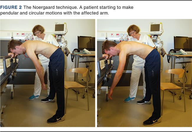 The patient is then instructed to bend forwards, resting the forehead on the back of the non-affected forearm, which is placed on the rail. The patient’s back should be as close to horizontal as possible. The affected arm should be relaxed and stretched, hanging straight down towards the floor (Figure 1). The patient is then instructed to relax as much as possible and make pendular and circular motions with the affected arm hanging down (Figure 2).