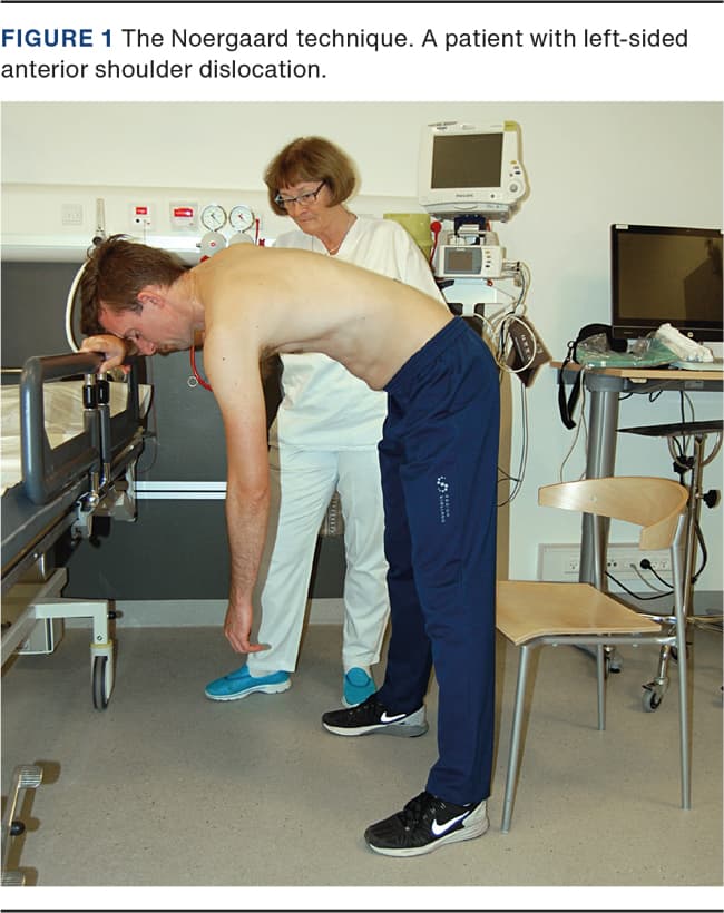 The aim of this study was to describe and evaluate the results of the Noergaard technique by retrospective analysis of patients admitted with and treated for anterior shoulder dislocation at the ED of Hvidovre Hospital in a one-year period.