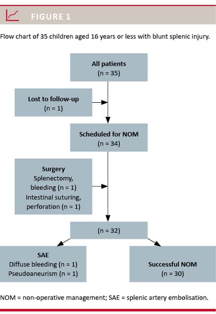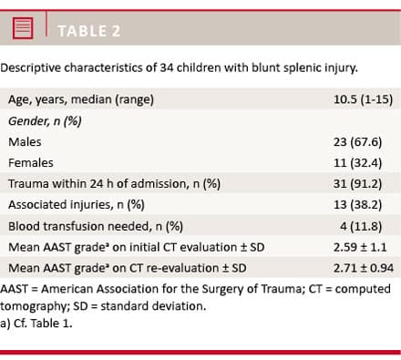 We conducted a retrospective observational study of 34 consecutive children (aged 16 years or less) admitted to our level 1-trauma centre with blunt splenic injury in the period from 1 January 2001 to 31 December 2012 (Figure 1).