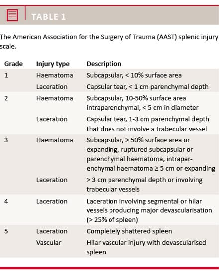 To obtain data on patient characteristics, treatment modality and outcome, we retrospectively reviewed all medical records. One specialist in radiology conducted re-evaluation of all admission CT images, blinded to the patient’s treatment and outcome, to provide information on the American Association for the Surgery of Trauma (AAST) splenic injury scale (Table 1) and contrast extravasation. CT images were available for all patients.