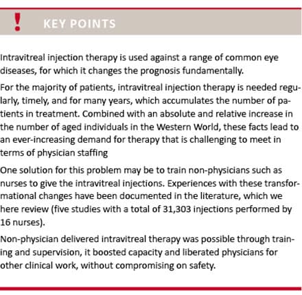 Injection with medicine directly into the vitreous body of the eye is a common clinical procedure with rare but devastating complications [25], and it is currently being delegated to non-physicians in an attempt to meet the increasing demands for intravitreal therapy. In this systematic review, we identified five studies reporting on experiences with non-physician administered intravitreal therapy which found that it was feasible to train nurses to deliver intravitreal injections and that safety was not compromised.