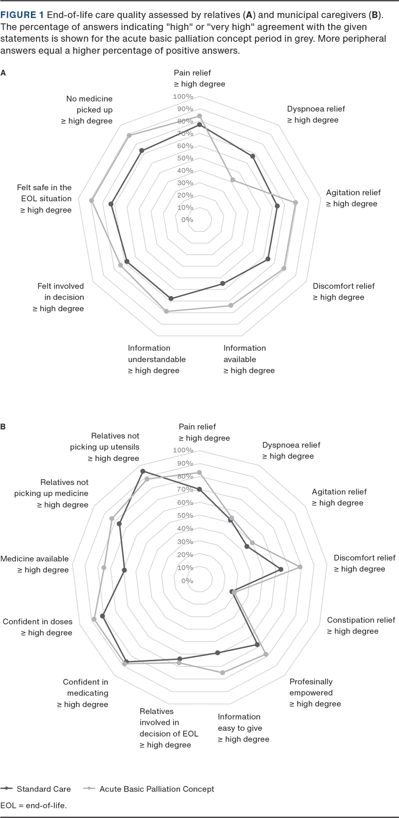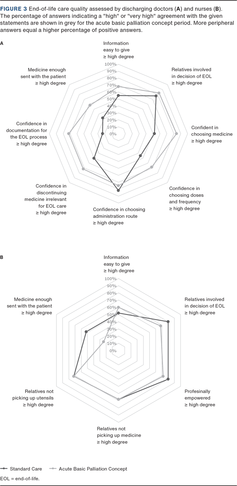 Figure 1 shows the percentage of positive scores for symptom control, with most peripheral scores being the best. Approximately 75% of relatives answered the questions of the survey. Figure 1A shows that relatives scored higher on three of four symptom management statements and lower on one statement during the ABPC period. In Figure 1B, municipal caregivers scored higher on two of five symptom management statements and similar for the remaining three statements during the ABPC period. Furthermore, they reported that enough medicine was provided at discharge 75% of the time during the ABPC period compared to 59% during the standard care period.