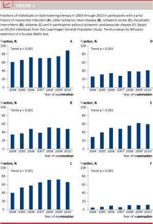 From 2004 through 2010, use of lipid-lowering therapy increased among participants in all four subgroups of ischaemic cardiovascular disease, in those with diabetes and in those without ischaemic cardiovascular disease (Figure 1).