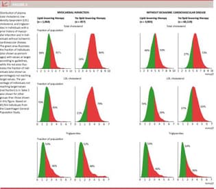The present data do not provide explanations as to why large factions of individuals with and without ischaemic cardiovascular disease, or with diabetes, do not receive lipid-lowering therapy, or do not have lipids treated to target values according to guidelines. However, medical doctors at hospitals and in general practice as well as the patients themselves all have part in the decision on whether to take lipid-lowering therapy or not, and in the decision on which type of lipid-lowering therapy to use. During hospitalisation, individuals with ischaemic cardiovascular disease and/or diabetes simply may not be prescribed lipid-lowering therapy. Also, if seen in general practice, doctors may not prescribe lipid-lowering therapy or may even decide to stop lipid lowering-therapy although such drugs were prescribed by hospitals. Finally, patient compliance may be poor either because of real or perceived side effects, or because of a wish not to take medications in general. Importantly, in Denmark it is unlikely that lipid-lowering therapy in general is not taken due to the cost, as the least expensive simvastatin 40 mg costs less than 0.2 Euro daily. However, part of the explanation as to why many patients on lipid-lowering therapy did not reach lipid targets may, indeed, be the cost as the more potent statins atorvastatin and rosuvastatin were 10-30 fold more expensive than simvastatin in Denmark in the period from 2004 through 2010; because atorvastatin lost its patent in Denmark May 2012 and in many other countries soon, the cost as an explanation for not reaching lipid targets may disappear in the near future. Other potential explanations as to why individuals treated with lipid-lowering therapy still have lipid values above guideline targets include 1) a low starting dose which has not been adjusted according to lipid levels, 2) side effects of lipid-lowering therapy that may require a lower dose than needed to reach guideline targets, 3) lack of patient compliance resulting in omission or partial omission of lipid-lowering therapy in the dose and frequency prescribed and last, but not least, 4) doctors’ lack of knowledge of current guidelines [15].