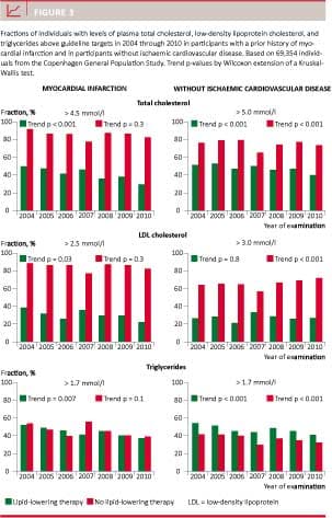 From 2004 through 2010, the fraction of participants on lipid-lowering therapy who were not treated according to guideline targets for total cholesterol decreased slightly, both for participants with a prior history of myocardial infarction and for those without ischaemic cardiovascular disease (Figure 3). However, the fraction of participants on lipid-lowering therapy, but not treated according to guideline targets for LDL cholesterol was similar from 2004 through 2010 in both groups or decreased only slightly. Finally, the fraction of participants on lipid-lowering therapy who were not treated according to guideline targets for plasma triglycerides declined slightly from 2004 through 2010, both for participants with a prior history of myocardial infarction and for participants without ischaemic cardiovascular disease.