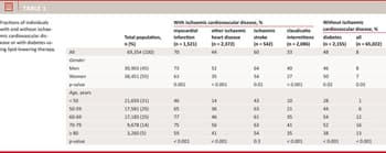 The fraction of participants using lipid-lowering therapy was 70% for those with myocardial infarction, 44% for other ischemic heart disease, 60% for ischemic stroke, 33% for claudicatio intermittens, 48% for diabetes, and 8% for those without ischaemic cardiovascular disease (Table 1).