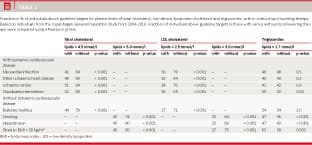 Among those with myocardial infarction with and without lipid-lowering therapy, 41% and 84%, respectively, had not reached a total cholesterol of < 4.5 mmol/l; 30% and 79%, respectively, had not reached an LDL cholesterol of < 2.5 mmol/l, while 46% and 48%, respectively, had not reached triglycerides < 1.7 mmol/l (Figure 2). In general, 30-50% of the participants with a prior history of ischaemic cardiovascular disease who were receiving lipid-lowering therapy still had a plasma total cholesterol > 4.5 mmol/l and an LDL cholesterol > 2.5 mmol/l (Table 2); among those not receiving lipid-lowering therapy, this was true for 80-90%. For plasma triglycerides, the fractions among those with ischaemic cardiovascular disease not reaching triglycerides < 1.7 mmol/l were 40-50%. This was true in both those with and without lipid-lowering therapy.