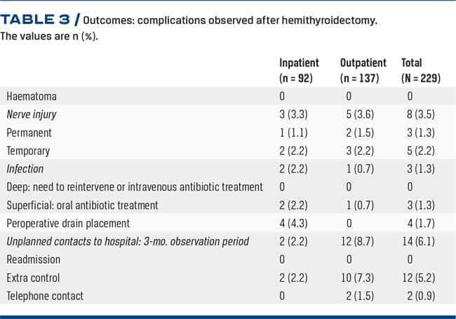 We found no significant difference in the rate of complications between hemithyroid surgery in an inpatient or outpatient setting. There were no PTBs or other life-threatening complications or additional surgery registered in either group.