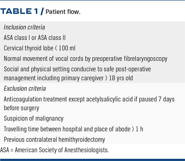 Traditionally, hemithyroidectomy has been an inpatient procedure with a minimum of 1-2 days of post-operative observation in the hospital due to the risk of serious post-operative complications. The major concern is the possible development of post-thyroidectomy bleeding (PTB), which may lead to a potentially life-threatening compression of the trachea [1]. The first description of hemithyroidectomy in an outpatient setting was described in the US [2] in 1986. Since then, the number of hemithyroidectomies and total thyroidectomies in an outpatient setting has increased [3, 4] especially in the US. Many of these studies have shown that outpatient thyroidectomy is safe and feasible with the incidence of PTB ranging from 0.19% to 0.48% [5-9]. There is no international consensus of the selection criteria for outpatient thyroid operations. The American Thyroid Association has developed a guideline for selection of patients for outpatient thyroidectomy focusing on American Society of Anesthesiologists (ASA) class, patient understanding/capabilities and home/geographical environment [10]. European studies have similar criteria, but no generic European guidelines exist [11-13].
