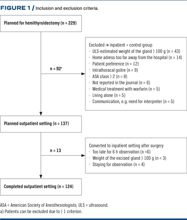 A total of 229 hemithyroidectomies were included in this study (Figure 1). Among these, 92 patients (40%) did not meet the outpatient criteria, primarily due to the ULS-estimated weight of the gland > 100 g. A total of 137 patients had planned outpatient surgery, among whom 124 (91%) completed the outpatient setting. For a variety of reasons (Figure 1), 13 patients were excluded from this outpatient group.
