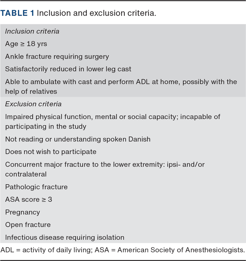 Patients will be included from the Department of Orthopaedic Surgery at Aalborg University Hospital, Denmark. An orthopaedic resident will assess the patients for eligibility based on consecutive sampling and the inclusion and exclusion criteria presented in Table 1.