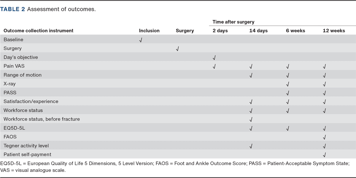 Secondary analyses will be conducted for the FAOS subscales (pain, symptoms, ADL, sport/rec and QOL), EQ-5D index and subscales (mobility, self-care, usual activity, pain and anxiety), EQ-VAS, ankle ROM and self-reported pain reactions. The difference between inpatient and outpatient care will be estimated using a linear mixed-effects regression model. Mean scores, SD, mean differences, 95% confidence intervals and p-values will be presented in a table. The following aspects will be incorporated into the model: the effects of the treatment arm, follow-up time and interaction. Adverse events, PASS, bone union and patient satisfaction will be compared between inpatient and outpatient care.