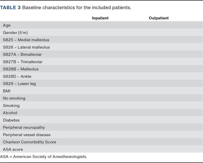 - Qin C, Dekker RG, Blough JT, Kadakia AR. Safety and outcomes of inpatient compared with outpatient surgical procedures for ankle fractures. J Bone Joint Surg Am. 2016;98(20):1699-1705. https://doi.org/10.2106/JBJS.15.01465
