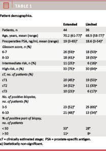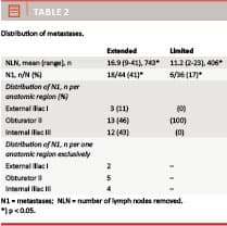 Objective: Pelvic lymphadenectomy remains the gold standard for providing a diagnosis of lymph node metastasis (N1) in prostate cancer patients who may be candidates for curatively intended radiotherapy (RT). The limited lymphadenectomy technique (L-PLND) provides removal of only a minority of lymph nodes within the expected regions of lymph node drainage of the prostate. We describe our extended lymphadenectomy (e-PLND) and the pathological outcome with a modified template as described by Briganti and compare it with L-PLND.