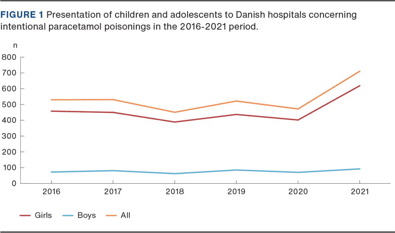 RESULTS. From 2016 to 2021, a total of 3,217 people under 18 years of age were admitted for paracetamol overdose. Among these, 86% (n = 2,755) were girls and 14% (n = 462) were boys. During 2020, a slight (7%) decrease in admissions was observed among both boys and girls compared with the preceding four-year mean value. In 2021, the number of overdoses among girls exceeded by 35% the former all-time high from 2016. Furthermore, the number of overdoses among girls exceeded the pre-four-year period mean value by 43%. Among boys, an 8% increase was seen from the highest ever previous value recorded in 2019 and a 23% increase compared with the previous four-year mean value.