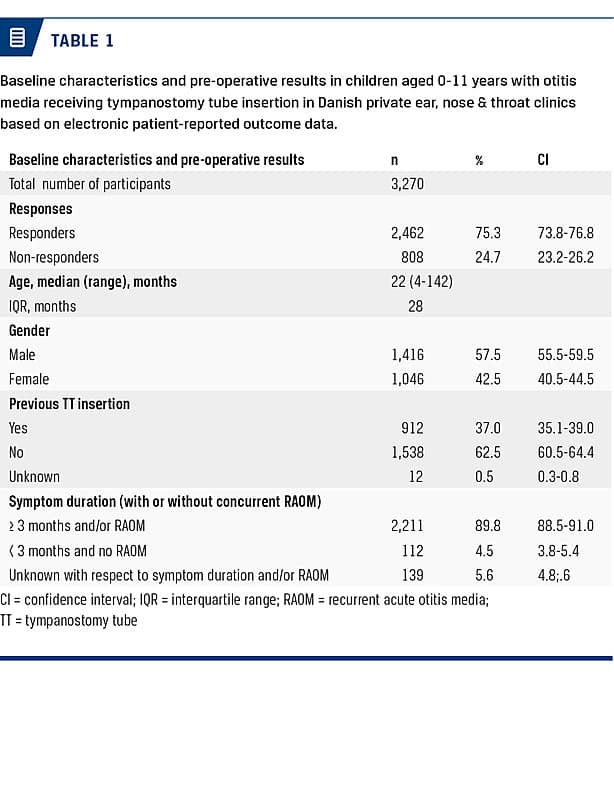 This study was a prospective, observational, multicentre study based on ePRO data from the Danish ENT Specialists Organisation (DØNHO) database, which was established in early 2017. A total of 17 Danish private ENT clinics, comprising 26 ENT specialists, have joined the database, registering patients offered TT insertion. The participating ENT clinics are geographically located in all five Danish regions. Inclusion of patients into the database is on-going, and the project can, if needed, prospectively be expanded to all 160 private ear-nose and throat (ENT) specialists in Denmark. The present study reports on the results from the first 3,553 patients enrolled from March 2017 to August 2018.