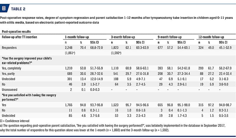 Earlier studies have investigated parent-perceived treatment effect after TT insertion in Danish children with COME and/or RAOM. A study among 24 private ENT specialists from 2010 investigated guideline adherence and parental satisfaction following TT insertion. A total of 426 children aged 0-6 years with OM offered first-time TT insertion were included. Parents and participating ENT specialists answered pre- and three-month post-operative questionnaires. Interrupted sleep and earache before TT insertion were reported in 60% of the children and hearing loss in 33%. Significant post-operative symptom regression was found, and 96% of the parents were satisfied with their child’s TT insertion [13]. Another study from 2015 investigating QOL differences among diagnostic subgroups of Danish children receiving TT for OM using the Otitis Media-6 questionnaire found significant QOL improvements in 491 children with RAOM, COME or both at 1-18 month follow-up after TT insertion [14]. As our study population was comparable in regard to age, gender composition and symptom burden prior to TT insertion, we believe that our data support these previous findings and vice versa.