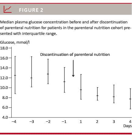 A sub-analysis was performed of the 32 patients who discontinued PN within the first 13 post-operative days. A pooled analysis of glucose data four days prior to and four days after discontinuation of PN revealed a median plasma glucose of 12.2 mmol/l and 8.4 mmol/l before and after discontinuation of PN, respectively (p < 0.001) (Figure 2).