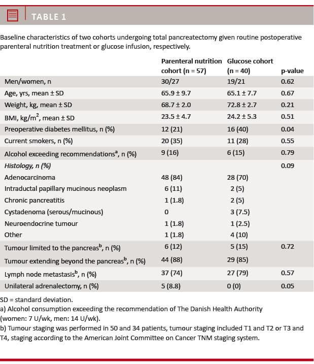 This retrospective study included 97 (92%) out of 106 patients undergoing total pancreatectomy between December 2009 and November 2014 at the Department of Surgical Gastroenterology, Rigshospitalet, Copenhagen. Nine patients were excluded because their diabetes charts were unavailable. According to the post-operative nutritional regimen, patients were divided into two cohorts; the PN cohort (n = 57) including patients who had a total pancreatectomy from August 2012 to November 2014 and the glucose cohort (n = 40) including patients who had total pancreatectomy between December 2009 and July 2012.