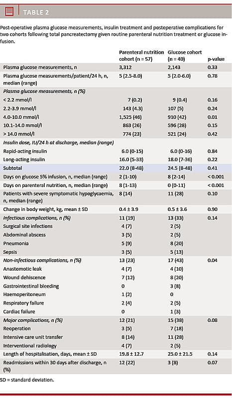 After total pancreatectomy, PN with insulin treatment per protocol improves glycaemic control compared with glucose infusion and reduces the number of non-infectious post-operative complications with no increase in hypoglycaemia. A non-significant reduction in length of hospitalisation was noted. Improved nutrition with PN was neither associated with incontrollable high blood glucose levels nor with a high prevalence of severe hypoglycaemia. PN and insulin per protocol offered slightly superior glycaemic control, but the median glucose levels were high during PN treatment. Based on this observation, it may be advisable to increase the amount of rapid-acting insulin added to the PN to 2 IU per 10 g of carbohydrate, which can probably be done without compromising treatment safety substantially.