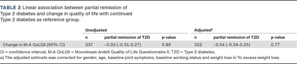 The difference in change in QoL from baseline to the one-year follow-up was –0.02 on M-A QoLQII in patients with partial remission of T2D relative to patients who still had T2D (Table 2). After adjustment for age, gender, joint symptoms, working status and %EWL, the difference in change in QoL was –0.04 on the M-A QoLQII in patients with partial remission of T2D relative to patients who still had T2D. The difference in change in QoL was insignificant in both the unadjusted and the adjusted analysis. In the adjusted analysis, a significant association between age and change in QoL was found.