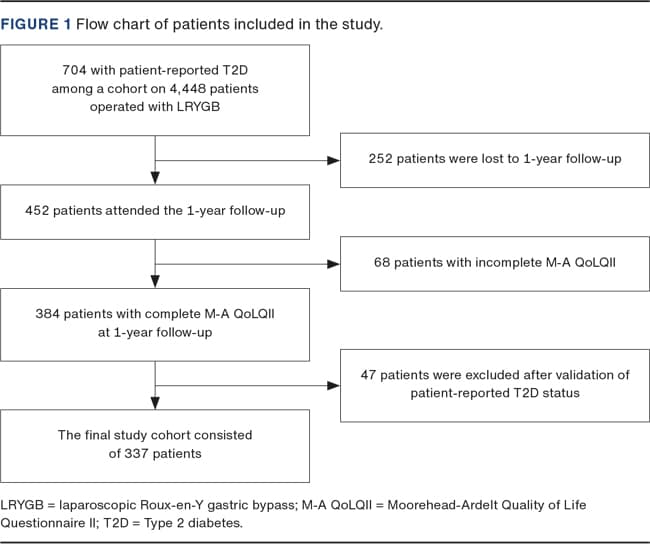 In the study period, 4,448 patients were treated with LRYGB at the private hospital Mølholm, Denmark. Of these patients, 704 had self-reported T2D at baseline and were included in the present study. A total of 452 patients attended the one-year follow-up health check, and 252 (35.8%) were lost to follow-up. Among the 452 participating patients, 68 had an incomplete M-A QoLQII, and an additional 47 patients were excluded after validation of the patient-reported baseline T2D status because their patient-reported answer did not match the response from the endocrinologist. After inclusion and exclusion, the final study cohort thus consisted of 337 patients (48%) (Figure 1).