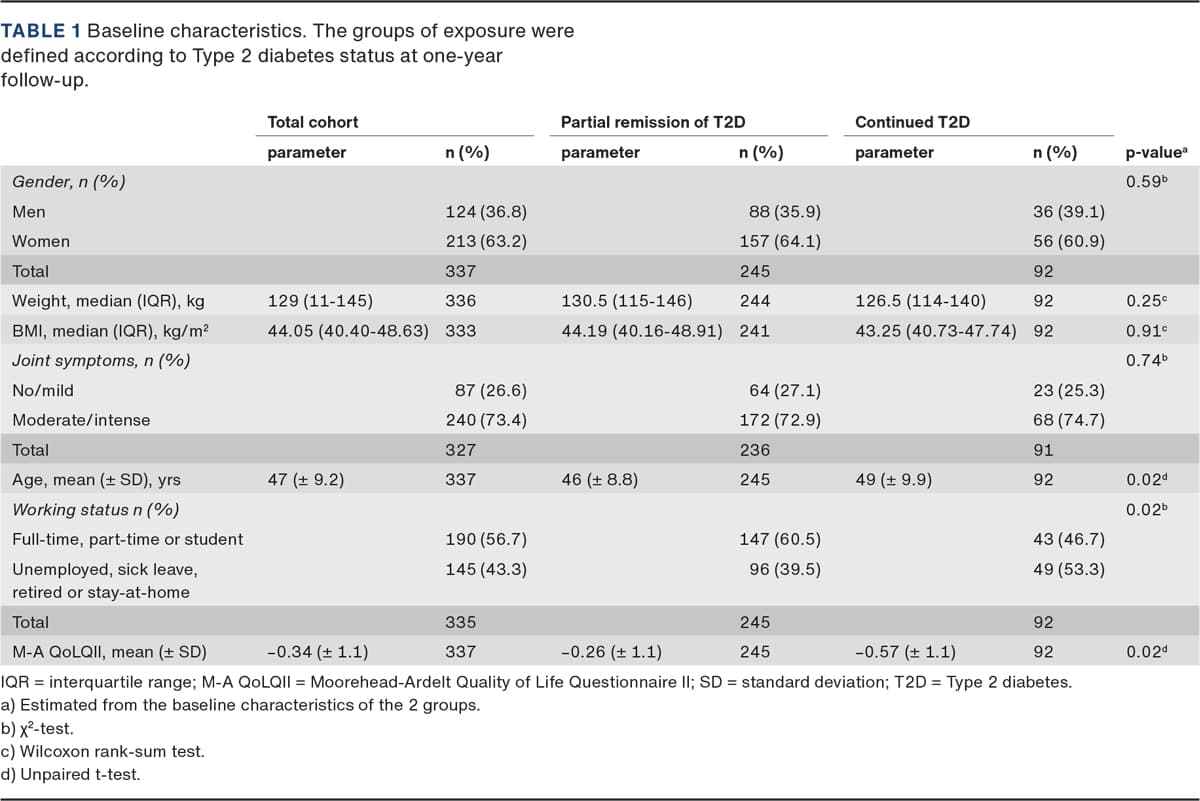 The majority of the patients in the study cohort were female (Table 1). The mean age was 47 years (± SD: 9.2), median weight was 129 kg and median BMI was 44.05 kg/m2. A total of 26.6% of the patients experienced no to mild joint symptoms and 76.4% experienced moderate to intense joint symptoms. A total of 56.7% of the patients were on the labour market and 43.3% were outside the labour market. At baseline, the mean QoL score was –0.34 (± SD: 1.1). The two exposure groups varied significantly on the variables of age (p = 0.02), working status (p = 0.02) and QoL (p = 0.02). The group with partial remission of T2D had a mean QoL score at baseline of –0.26, and those who still had T2D reported a mean QoL at baseline of –0.57.