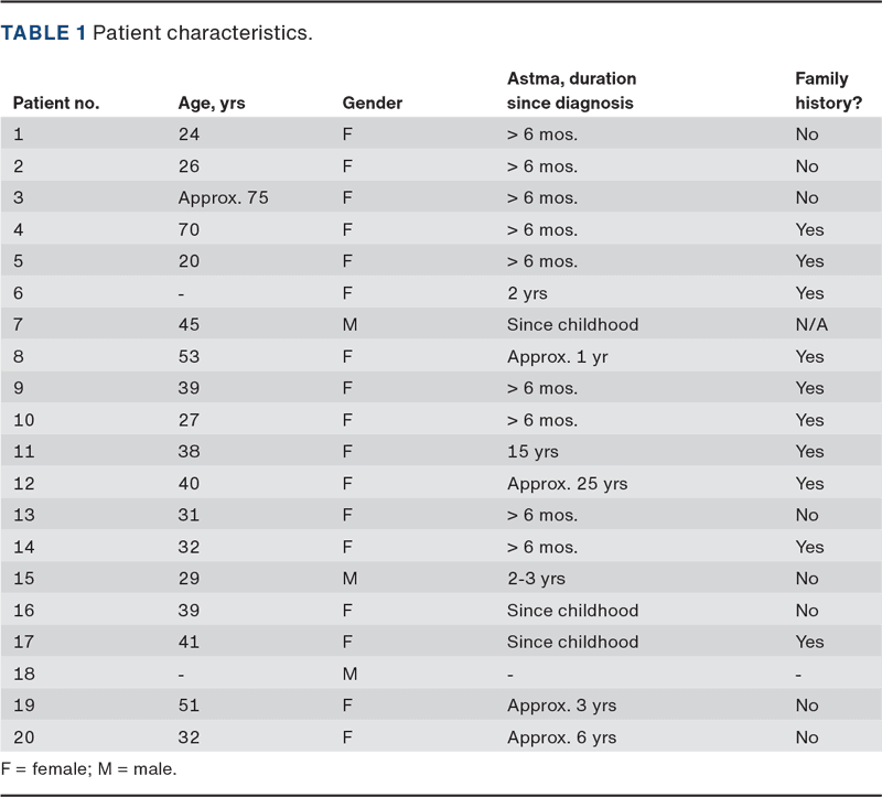 We set out to include 20 patients aged 18-40 years. However, early in the study, we decided to include a few patients older than 40 years to supplement younger patients’ statements; we ended up including six (out of 20) patients older than 40 years. Other inclusion criteria were symptoms of variable breathlessness, a diagnosis of asthma based on either significant reversibility to 400 μg salbutamol (increase in forced expiratory volume in the first second (FEV1) of 15%, at least 400 ml) or a positive mannitol or methacholine challenge (the latter with PD20 < 900 μg methacholine), and informed consent. We excluded patients with > 10 pack-years, significant comorbidities (based on the investigators’ judgement, e.g. fixed airflow limitation believed not to be the result of chronic asthma), and significant language barriers.