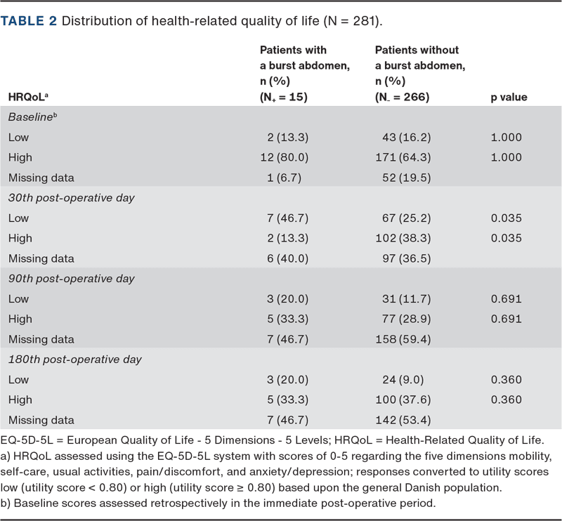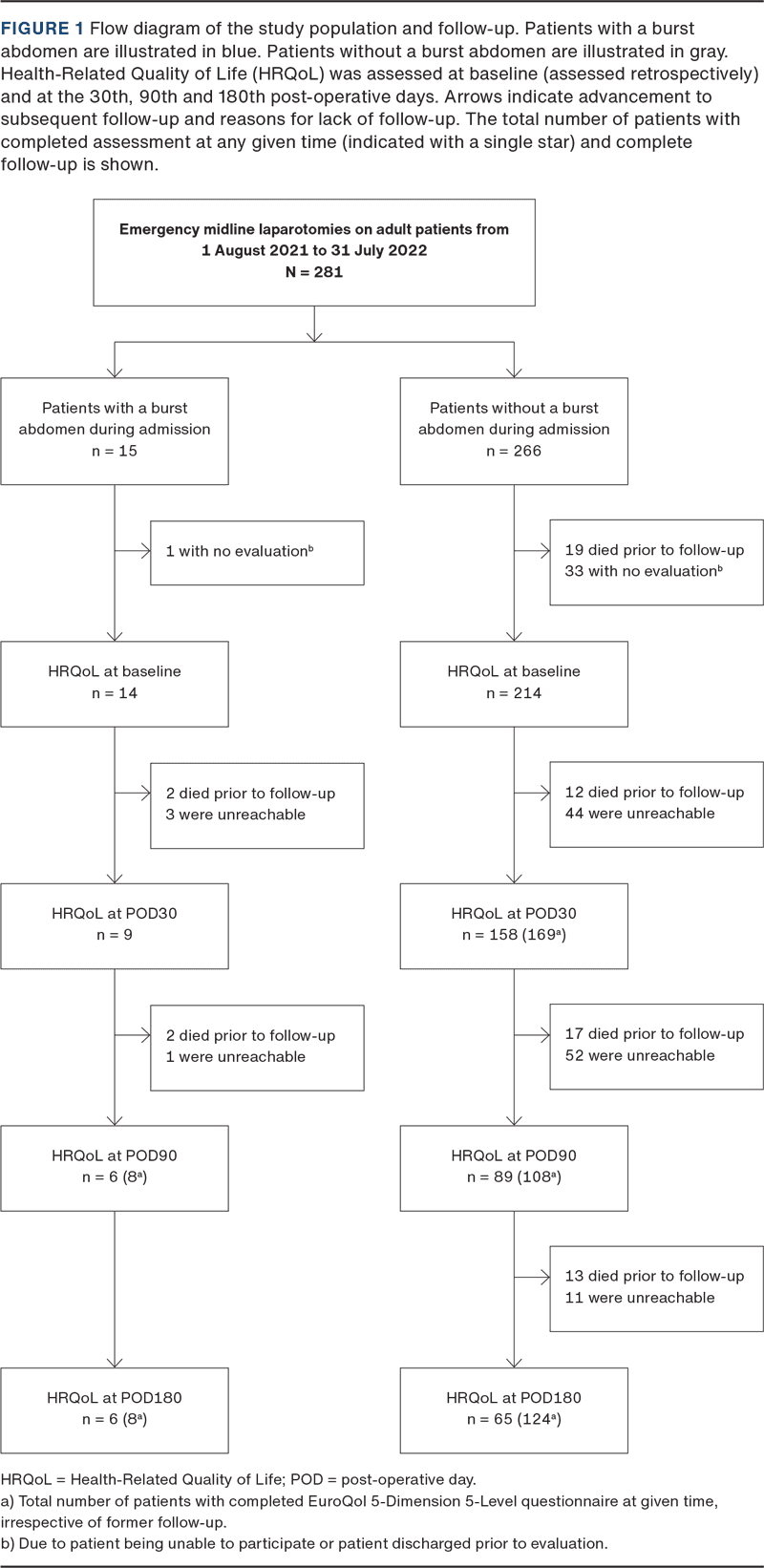 The primary outcome was to observe HRQoL in patients after emergency laparotomy and investigate differences in patients with a burst abdomen compared with the rest of the cohort. Secondary outcomes included 30- and 90-day mortality and length of hospital stay.