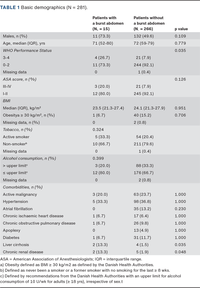 The patients with a burst abdomen had basic demographics comparable to patients without a burst abdomen (Table 1). No statistical difference was found regarding sex or age. Patients with a burst abdomen more often presented with poor performance (WHO Performance Status ≥ 3) than patients without a burst abdomen (four of 15 patients, 26.7% versus 21 of 266 patients, 7.9%; p = 0.035). Furthermore, patients with a burst abdomen had a higher incidence of liver cirrhosis (two of 11, 13.3% versus four of 266, 1.5%; p = 0.035) and chronic renal disease (two of 17, 13.3% versus five of 266, 1.9%; p = 0.048) (Table 1).
