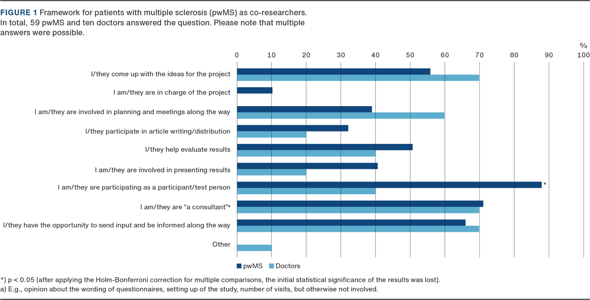 PwMS were asked: “If you could imagine yourself being a co-researcher, what should the framework be like?”. The doctors were asked: “Could you imagine using patient involvement in your future (or current) research? If so, what role do you think patients could play? (Figure 1).
