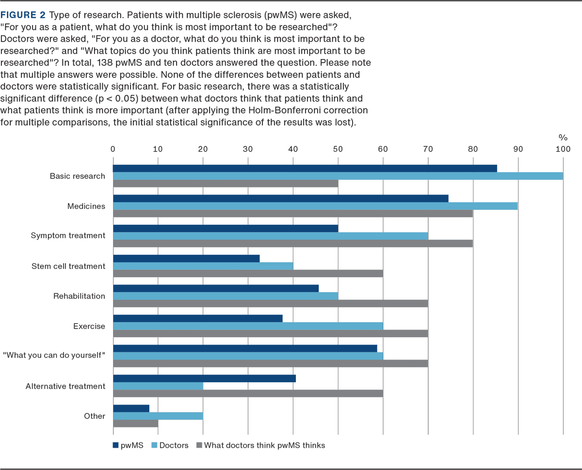 We found an agreement on what pwMS and doctors believed were the most important topics for research. Interestingly, for basic research, doctors thought that patients would find this topic less important than they did (Figure 2).