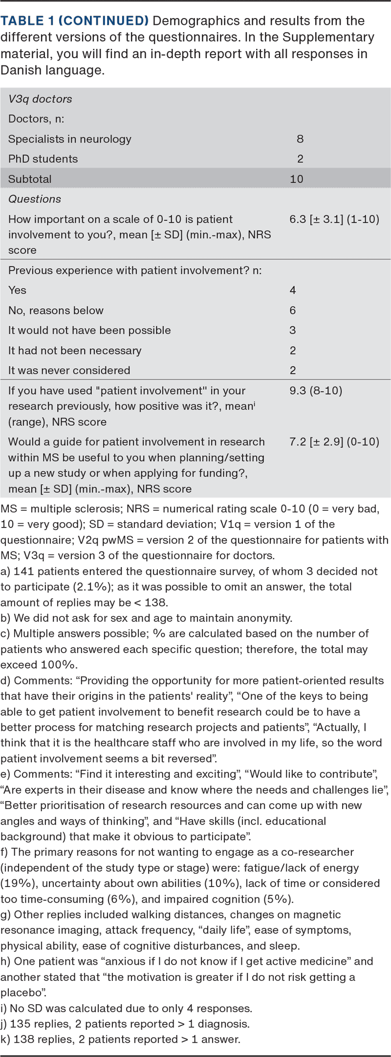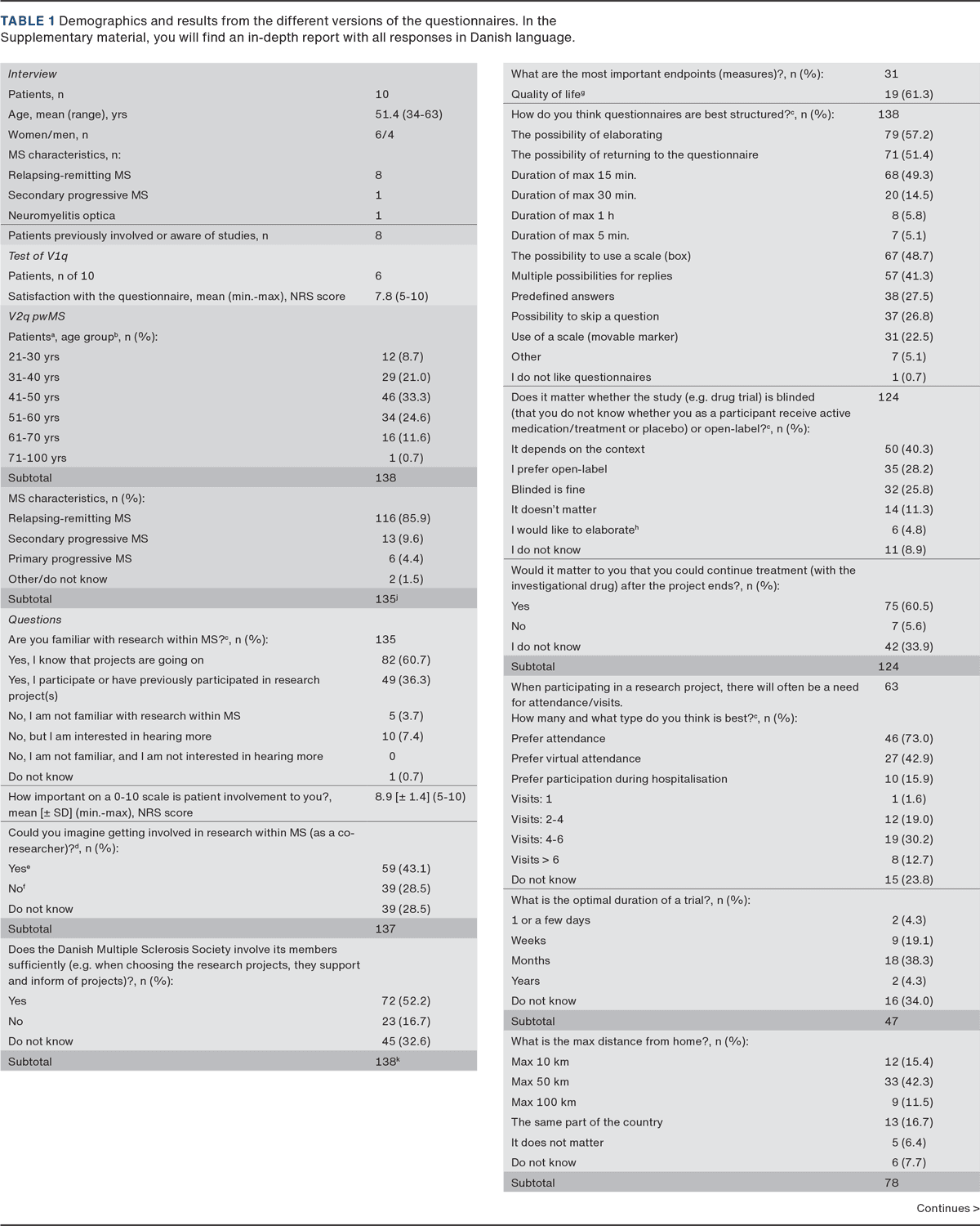 Due to the word limit, we have focused on the quantitative data in the main manuscript. In the Supplementary material, we provide an in-depth report comprising all responses in Danish, including both the interviews and the questionnaires. Table 1 presents the preferred study designs (blinded/non-blinded), the optimal study duration, types of visits and distances from the patients' homes. Respondents had lived with the MS diagnosis for a mean period of nine years (mean), SD 7.0 (range: 0-30 years).