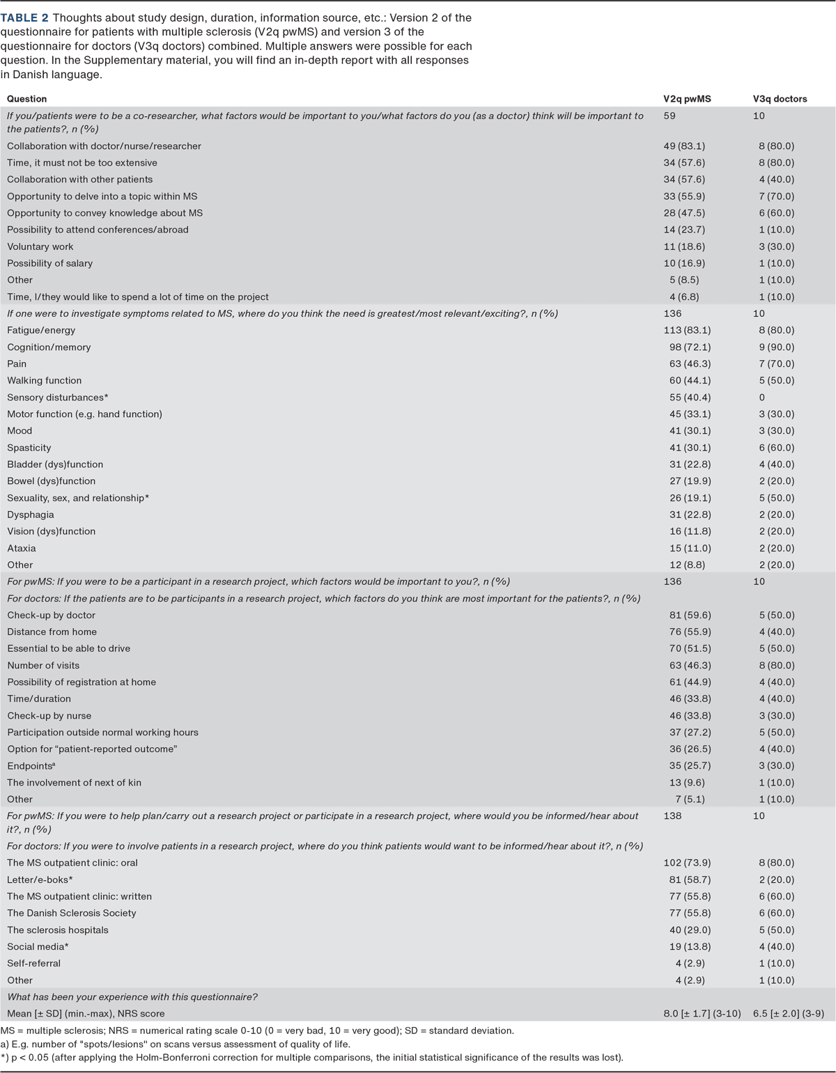 In our project, we asked about the construction of questionnaires, and - for almost all questions - it was possible to elaborate on the answer provided. According to our survey, the questionnaire should take a maximum of 15 minutes to complete (similar to findings from Skovlund et al. [20]) and allow the use of a scale, e.g., 0-10, by "clicking off a box". Furthermore, it may well offer multiple answer options, and most patients would like the option to return to the form. Regrettably, we missed the chance to incorporate that last aspect into this project. It is, however, essential to keep this in mind when designing future questionnaires. Regarding where to get information about research, both pwMS and doctors agreed on the outpatient clinic, and patients preferred distributing the questionnaire by letter/e-boks rather than via social media.