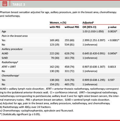 The odds ratio for PBS and pain in the breast area showed that women who experienced PBS had a three times higher prevalence of pain than other mastectomised women. This association is likely to be caused by phantom breast pain, but the questionnaire did not provide distinct questions to differentiate between phantom breast pain and pain in the breast area.