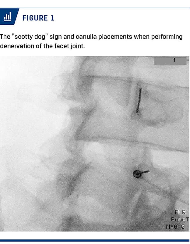 Fluoroscopy guidance was used for the RF denervation procedure using an oblique lateral view to clearly visualize the “scotty dog” sign (Figure 1). 1 ml of bupivacain 20 mg/ml was applied before denervation was initiated. Denervation was performed at 90 °C for 60 seconds at two locations of the facets. The locations were at the distal and the proximal lateral part of the facet joints capsule (Figure 1). For this study, we used the Stockert Inomed n50 generator with a 20G 150-mm isolated cannula with a 5-mm active tip. No stimulation was used as we did not aim directly for the medial branch.