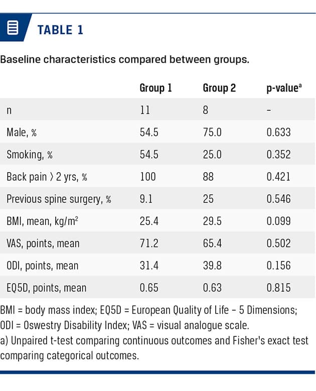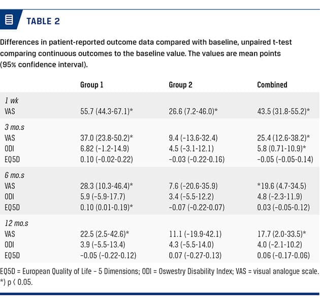 For the total sample, we found a significant improvement in ODI at the three-month follow-up of 5.8 points; and at six months, we found a 0.10-point EQ5D improvement in Group 1. No other improvements were seen in ODI or EQ5D during follow-up (Table 2).