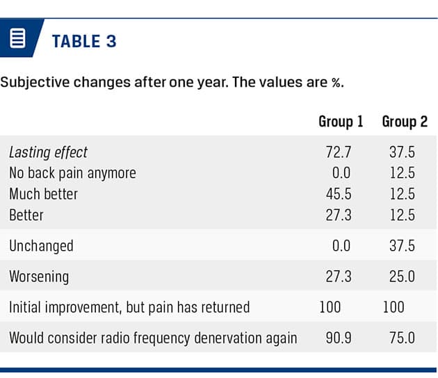 follow-up period. Table 3 shows that a total of five patients reported worsening of their back pain at the one-year follow up. However, when analysing these five patients, it becomes clear that four of these patients experienced pain relief during follow-up, but that their pain had returned. The same four patients replied that they would like a new treatment if possible. The fact that some patients experience good results in the initial phase of the study but had increasingly more pain during follow-up may be due to the neural regeneration of the facets and the natural course of a degenerative low-back disease. Despite the diminishing effects, 84% from the entire sample wanted new treatment, if possible, which implies that the discomfort associated with the RF denervation is outweighed by the improvement in their symptoms. One must keep in mind that this is an outpatient procedure requiring neither hospitalisation nor sedation. Generally, each procedure took around 40 minutes to complete and patients tolerated the procedure well without complications. This taken into consideration makes RF denervation attractive to the group of patients that have no other treatment options left for their chronic back pain.