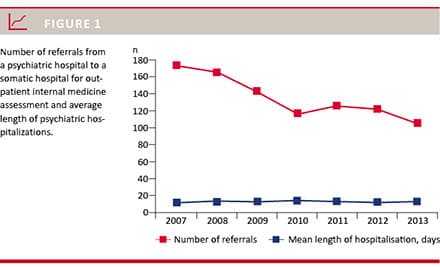 From 2007 to 2013, the length of hospitalisations remained stable, but the total number of referrals to specialists in internal medicine decreased by about one third (Figure 1). Of the 110 referrals, 28 (25%) were from the Department of Organic Psychiatric Disorders, 22 (20%) from the Department of Psychosis, 26 (24%) from the Department of Affective Disorders and 16 (15%) from the Department of Forensic Psychiatry. A total of 14 referrals (13%) were from the outpatient clinic’s section at the four respective departments.