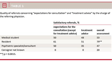 As expected, the referrals of the lowest quality originated from the small group of non-identifiable physicians but apart from those, the poorest referrals originated from the psychiatric specialists and the senior consultants. A trend towards a higher quality of the referrals completed by residents is significant for the overall assessment of the referral document.
