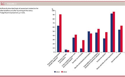 As illustrated in Figure 3, most of the ratings of the topics assessed in 2012 did improve after the status report was launched, but only the referring diagnosis and expectations for the consultation/treatment improved significantly.